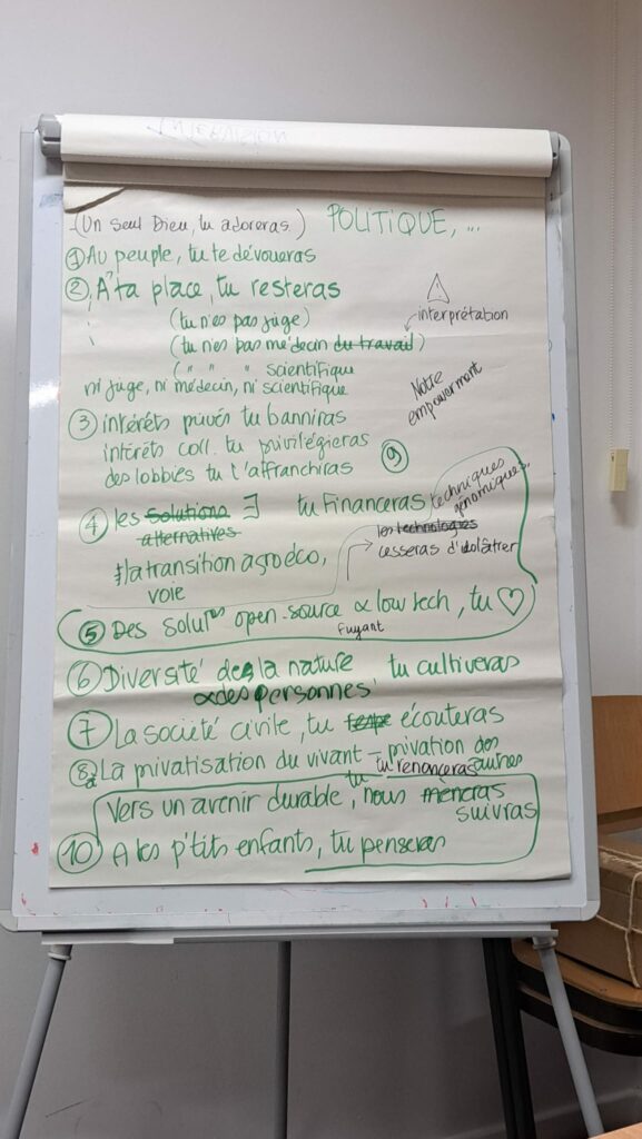 A l’initiative de Nature et Progrès – Locale de Namur, l’UNAB, Humundi, le réseau des Gasap et Terre en Vue, des citoyen·nes se sont réunis ce 8 octobre à Mundo Namur, pour confronter leurs con·sidérations quant à la manière dont la Déclaration de Politique Fédérale MR-Engagés malmène nos intérêts, sociaux et environnementaux, en lien avec la politique Alimentaire. C’est par un atelier d’intelligence collaborative que les participants ont d’abord formulé leurs observations critiques, avant de les reformuler en slogans de manifestation en vue de la Manifestation nationale prochaine organisée le mardi 14 octobre prochain à Bruxelles. La CAN était présente à cet atelier et a joint sa voie à cette réflexion constructive.