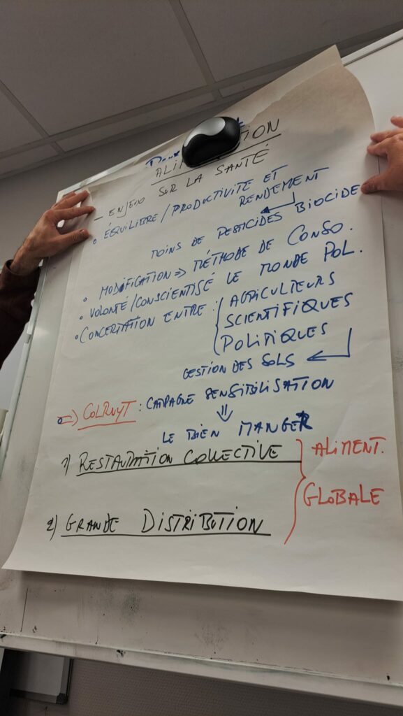 C’est à l’invitation du CEPAG (Centre d’Education Populaire André Genot – FGTB) et notamment de sa Cellule Rise (dédiée à la Sensibilisation à l’Environnement) que 3 structures engagées sur le terrain de l’alimentation durable, Manger Demain, Slowfood et la Ceinture Alimentaire Namuroise, sont venues témoigner de leur travail de terrain. La journée de formation syndicale organisée en inter sectoriel, consacrait son après-midi à la question de la transition alimentaire, un champ d’action politique dans lequel les syndicats peuvent aussi faire entendre leur voix. Non seulement interpeler le politique pour toujours plus de relocalisation de notre politique alimentaire, mais envisager aussi comment, au sein des entreprises, les employé·es et travailleur·ses peuvent être force de propositions. Que ce soit au sein des instances représentatives (délégation syndicale, C.E., CPPT…) ou par une attitude personnelle d’exemplarité pouvant nourrir de nouvelles pratiques alimentaires chez tout un chacun. La force du colibri jointe à une politique faisant primer le bien commun sur les intérêts privés.